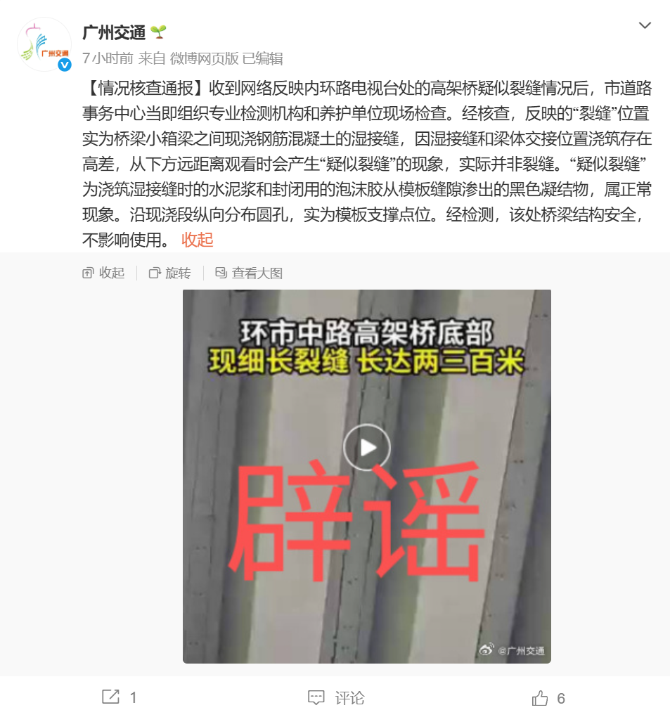 内环路高架桥有疑似裂缝,广州交通局辟谣